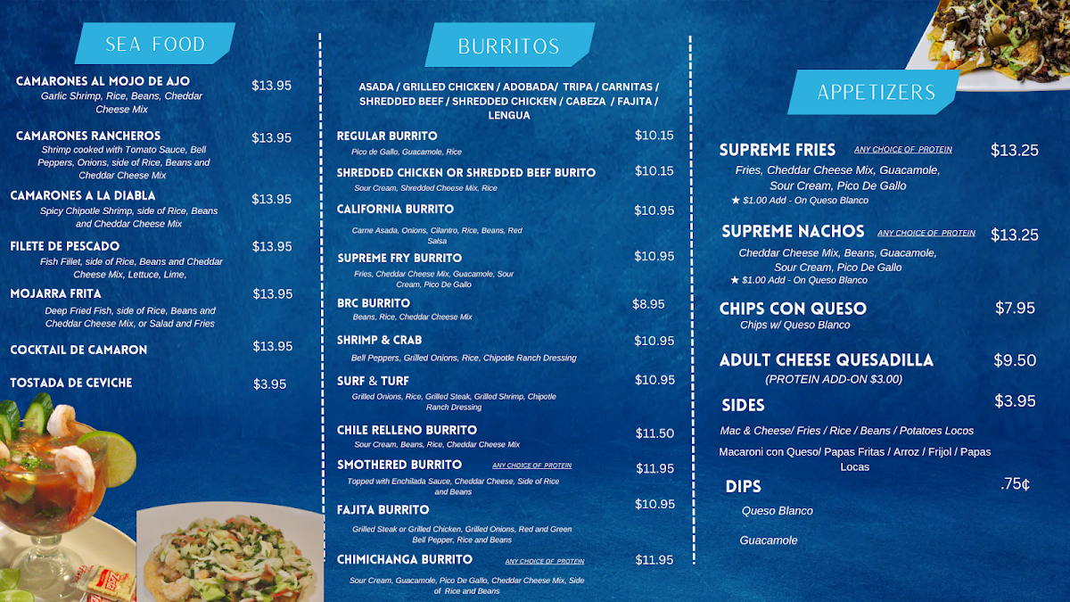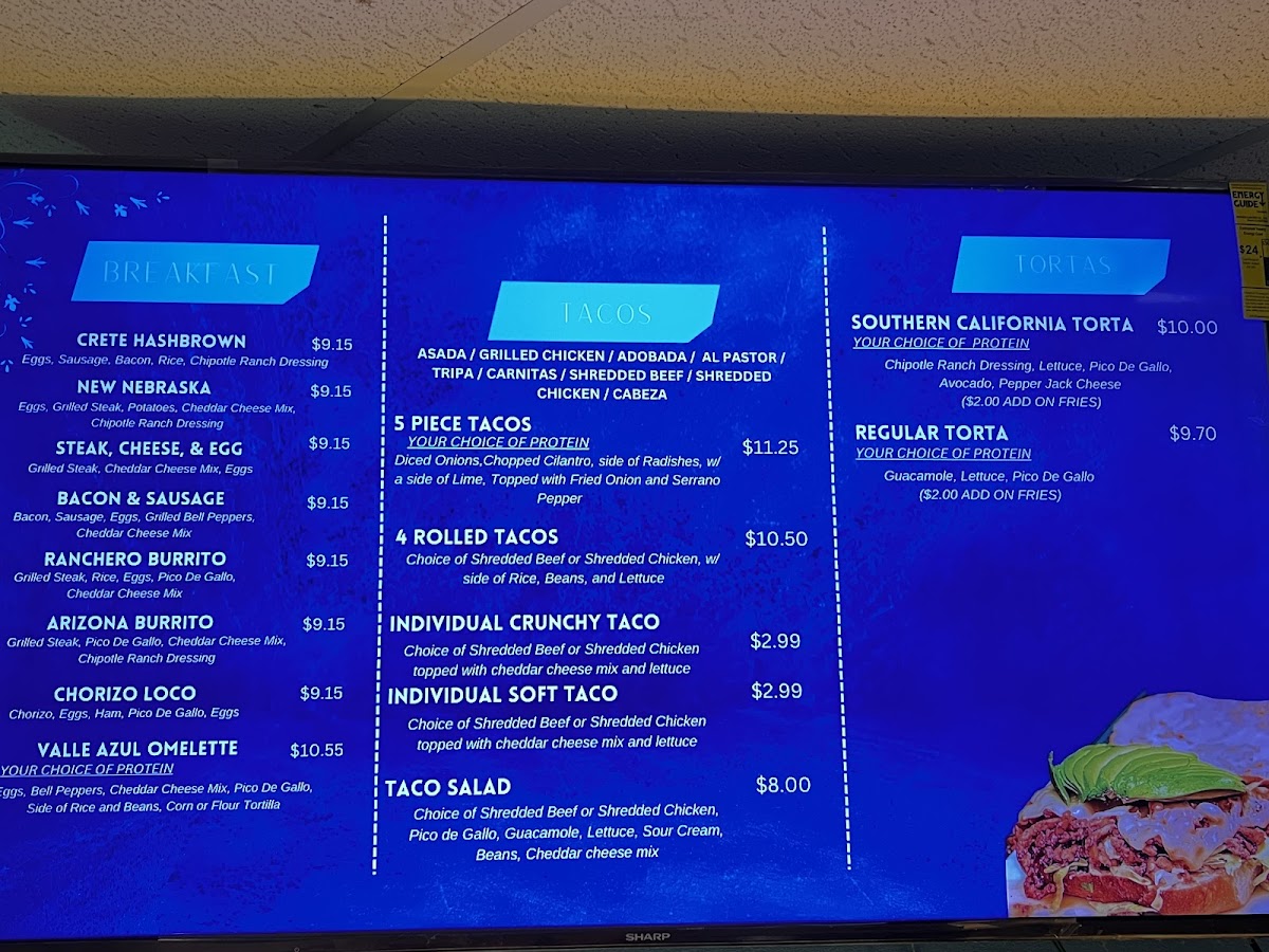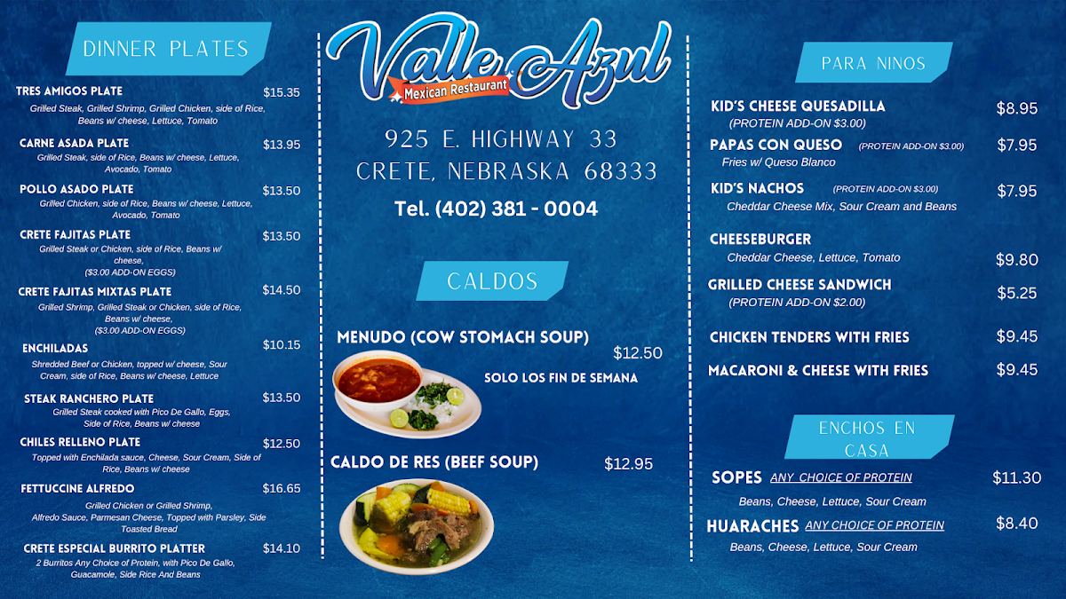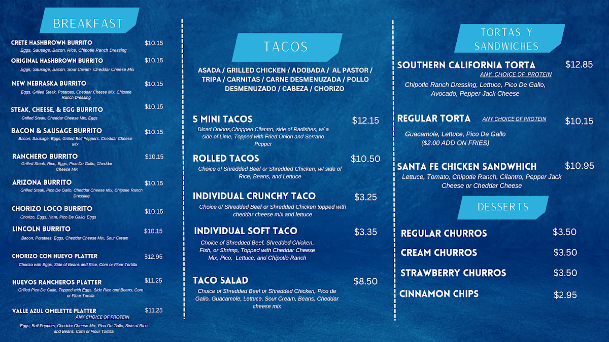 Valle Azul Mexican Restaurant at 925 NE-33 in Crete delivers a menu that balances classic comfort with bold Mexican flavors. Among the highlights, the Smothered Steak Burrito stands out with its hearty portion and rich, savory sauce that perfectly complements tender steak. The Supreme Nachos offer a festive mix of melted cheese, fresh toppings, and zesty seasoning, ideal for sharing or savoring solo. Seafood lovers will appreciate the Camarones Rancheros, where succulent shrimp are served in a flavorful, tangy sauce that captures the essence of coastal Mexican cuisine. For a lighter yet satisfying option, the Chicken Sandwich combines juicy, well-seasoned chicken with fresh accompaniments in a perfectly toasted bun. The menu also features the spiced, marinated Adobada, which bursts with traditional flavors in every bite. Rounding out the experience, the sweet and creamy Horchata provides a refreshing finish, balancing the richness of the main dishes. Overall, Valle Azul’s menu demonstrates thoughtful variety, generous portions, and authentic Mexican flavors that make it a standout destination for both casual meals and special indulgences.